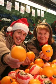 So köstlich schmeckts zur WeihnachtszeitWilli mit der Obsthändlerin Elisabeth Sigrüner auf dem Viktualienmarkt.Bild: © BR/megaherz gmbh/megaherz gmbh