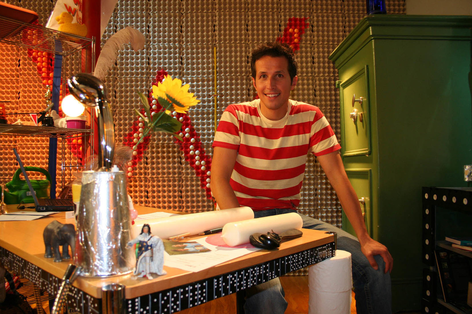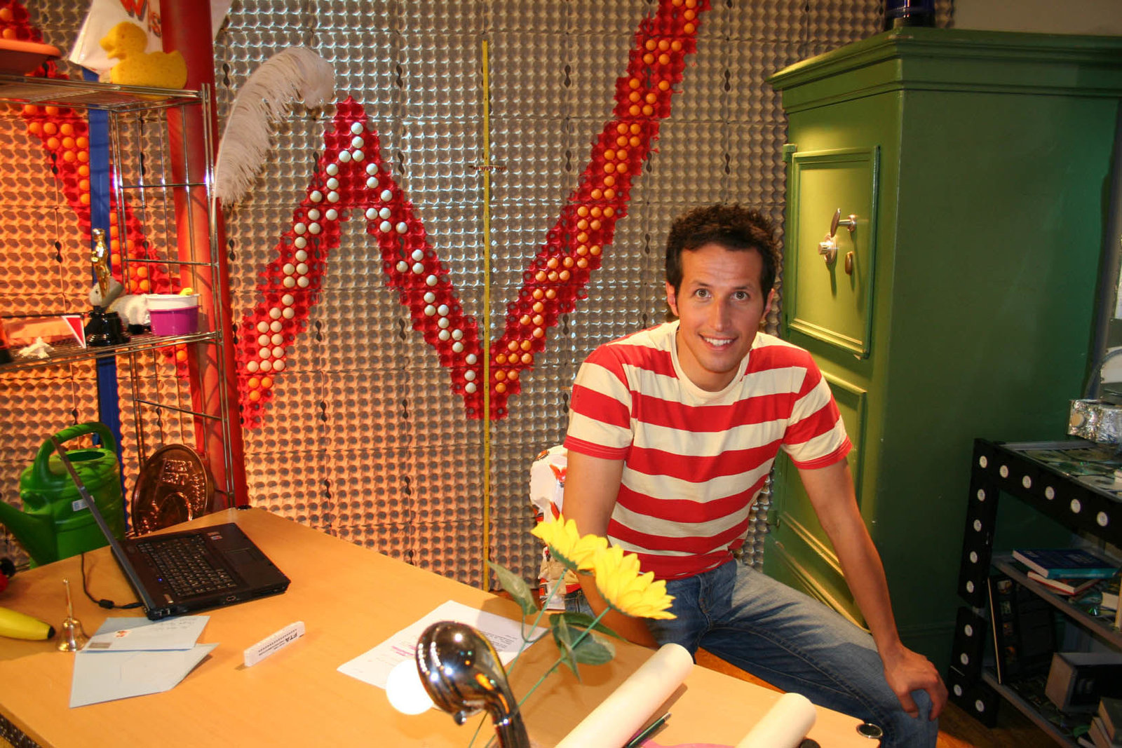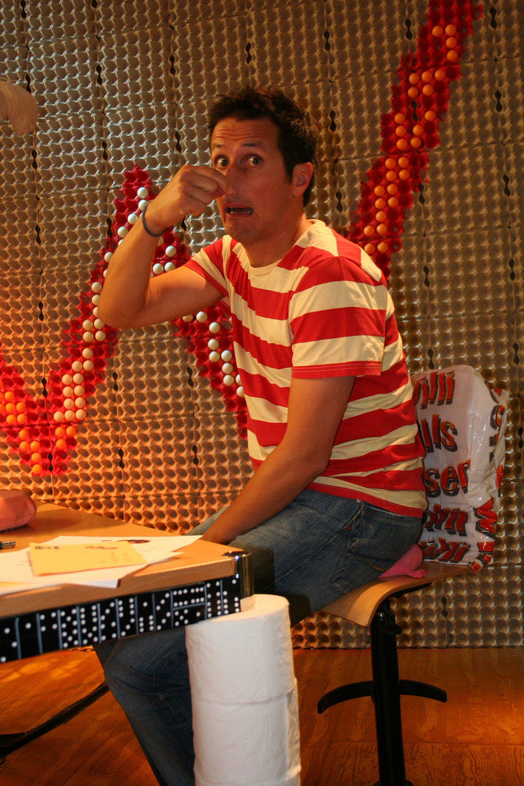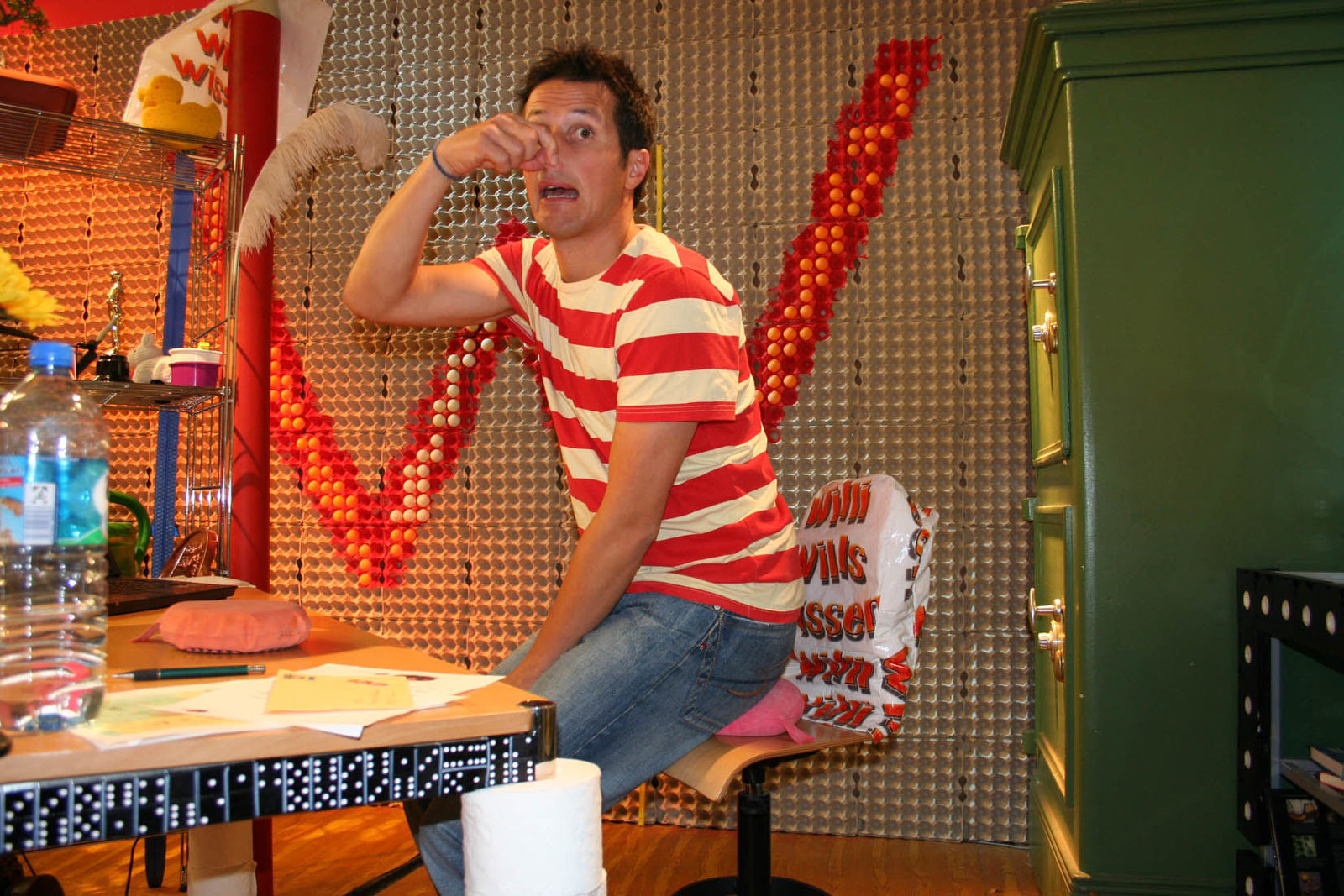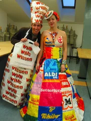 Wie kommt das Plastik in die Tüte?Willi Weitzel und eine Tütendesignerin Friederike im Tütenoutfit. Heute möchte Willi wissen, wie Produkte aus Kunststoff hergestellt werden.Bild: © BR/megaherz gmbh