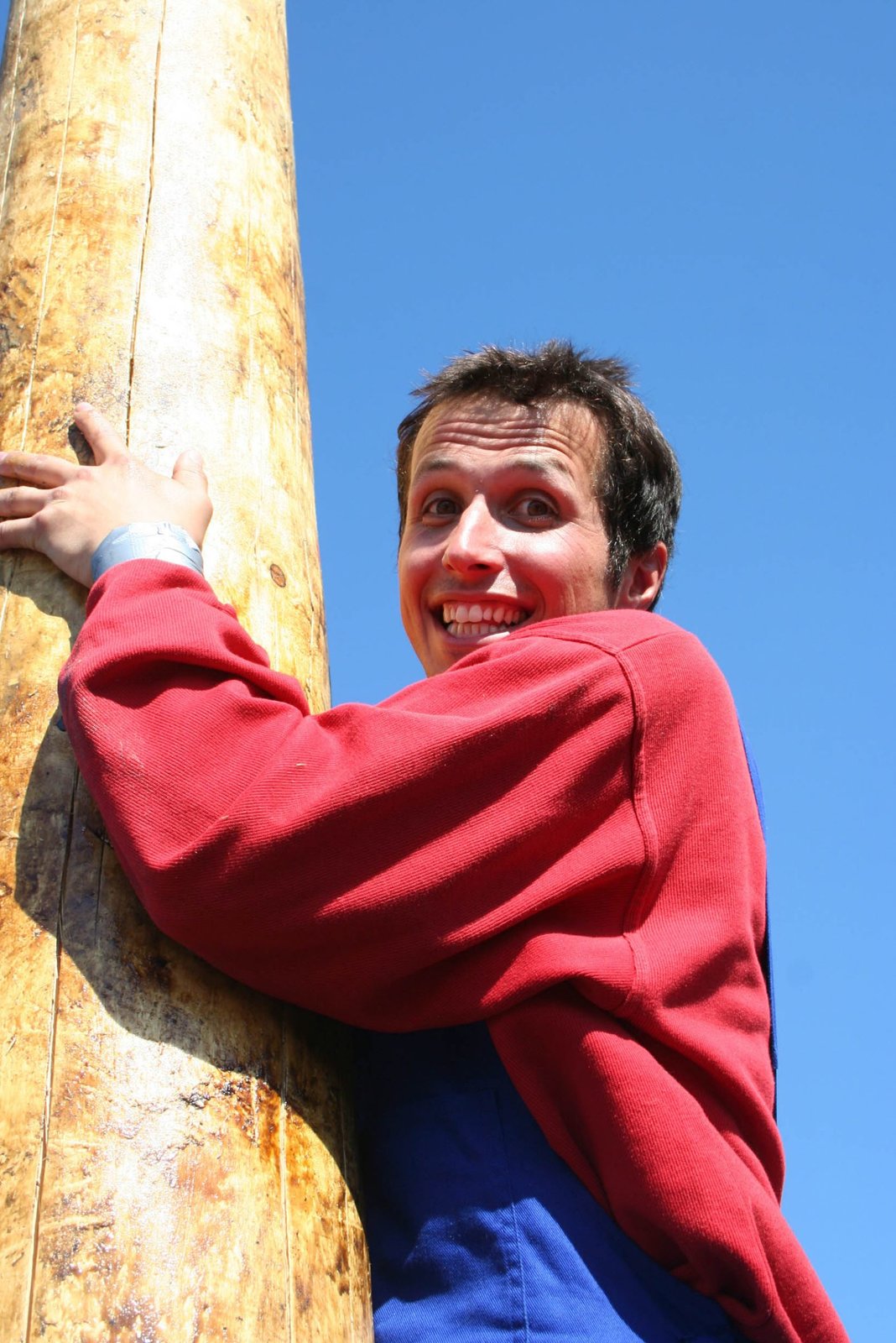 Wie wird ein Maibaum aufgestellt?Willi beim Maibaumkraxeln im österreichischen Freinberg. Ohne Sicherung klettert er den Baum hinauf und nur das Baumharz, mit dem er die Hände und Füße eingerieben hat, gibt ihm Halt.Bild: © BR/megaherz gmbh