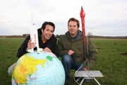 Wie sieht die Welt im Weltraum aus?Willi (links) und der Raumfahrtexperte und Raketenbauer Matthias Raif von der Technischen Universität in Garching bei München. Matthias hat das Modell einer Ariane-5-Rakete mitgebracht.Bild: © BR/megaherz gmbh