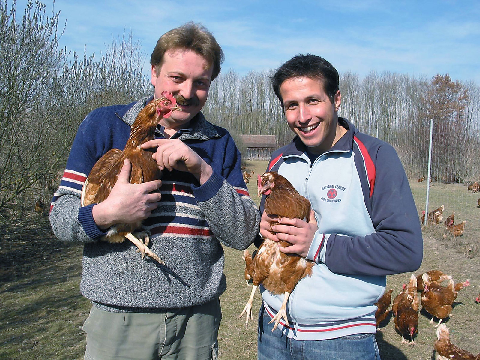 Ach du dickes Ei!Willi (re.) und Sigi Rettermeier bei den Legehennen. © BR/megaherz GmbH - Honorarfrei nur im Zusammenhang mit genannter Sendung bei Nennung "Bild: BR/megaherz GmbH". Andere Verwendung nur nach Absprache. KI.KA, Marketing & Kommunikation, Tel.: 0361/218-1826, Fax: -1831Bild: © BR/megaherz GmbH