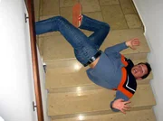 Wer bringt die Action in den Film?Willi Weitzel lässt sich von einem Stuntteam zeigen, wie die Action in den Film kommt. Gut gepolstert und mit der richtigen Technik stürzt er eine Treppe hinunter.Bild: © BR/megaherz