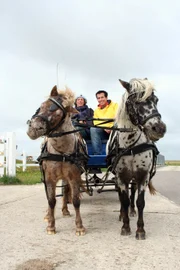 Wer weiß mehr übers Wattenmeer?Kerstin Ketelsen und Willi in einer Pferdekutsche auf der Hallig Hooge, auf der nur 111 Menschen leben.Bild: © BR/megaherz gmbh/