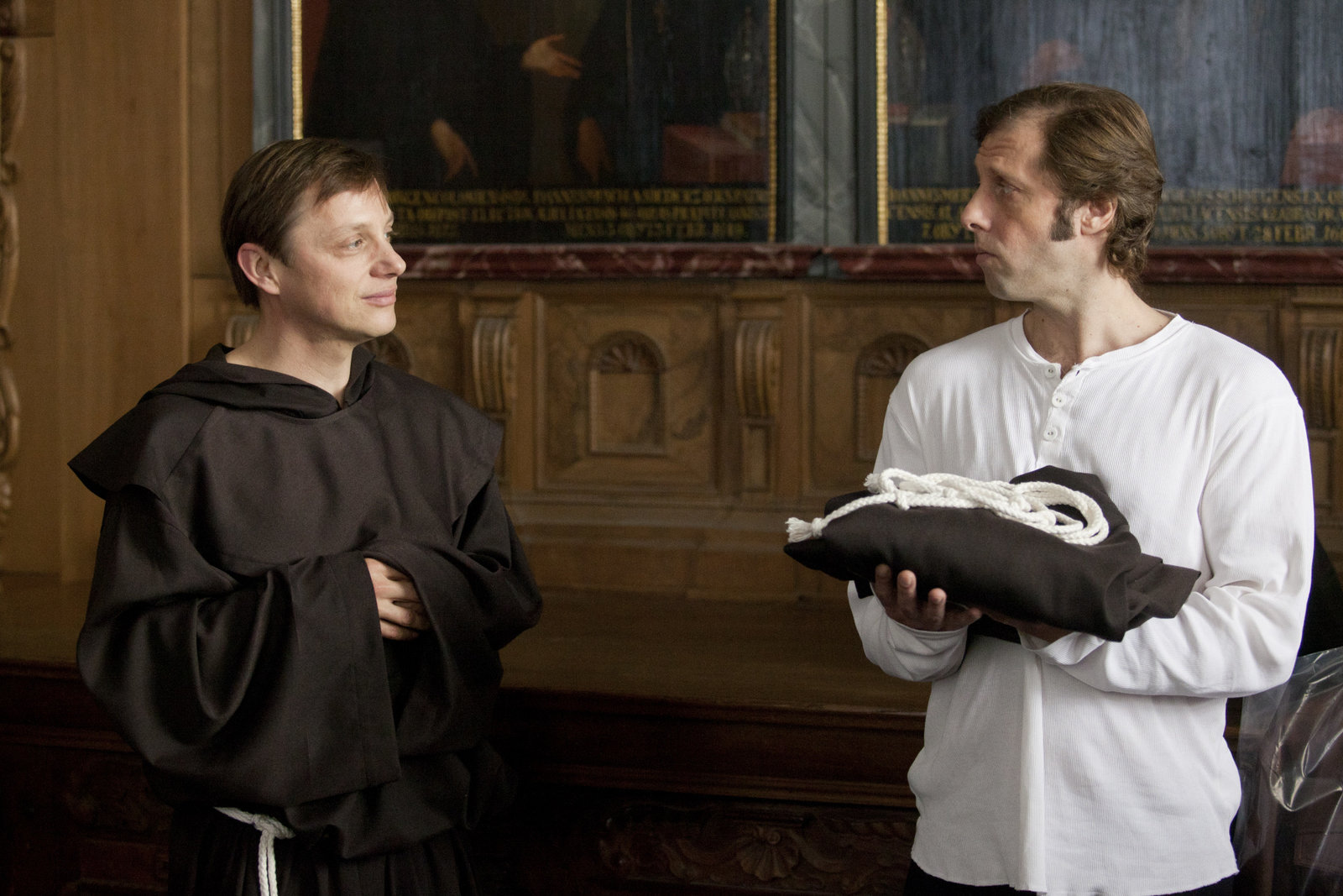 Im Namen der RosiBruder Antonius (Arndt Schwering-Sohnrey, li.) erläutert Ekki (Oliver Korittke) die Klosterregeln .Bild: © ZDF und Thomas Kost