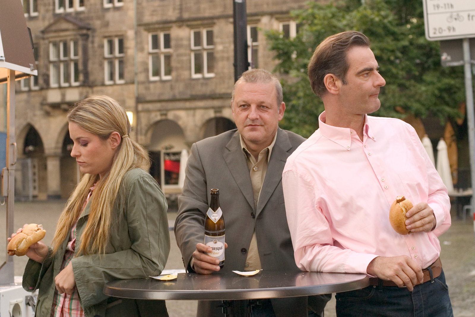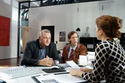 Die WiedertäuferPrivatdetektiv Wilsberg (Leonard Lansink, l.) gibt sich bei der Fondsmanagerin Claudia Weinert (Loretta Stern, r.) als potenter Kunde aus, der fünf Millionen anlegen möchte. Ob er da nicht ein wenig zu hoch pokert? Steuerprüfer Ekki Talkötter (Oliver Korittke, M.) fällt die Kinnlade herunter.Bild: © ZDF und Martin Lässig