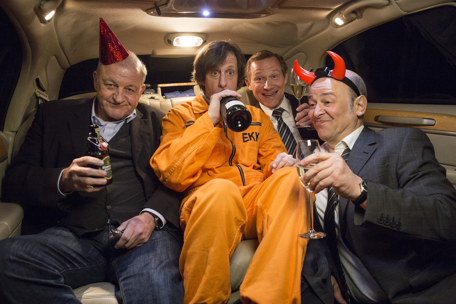 Alle Jahre wiederWeihnachtsgruß von Georg (Leonard Lansink, r.), Ekki (Oliver Korittke, 2.v.l.), Alex (Ina Paule Klink, 2.v.r.) und Overbeck (Roland Jankowsky, l.).Bild: © ZDF und Bernd Spauke
