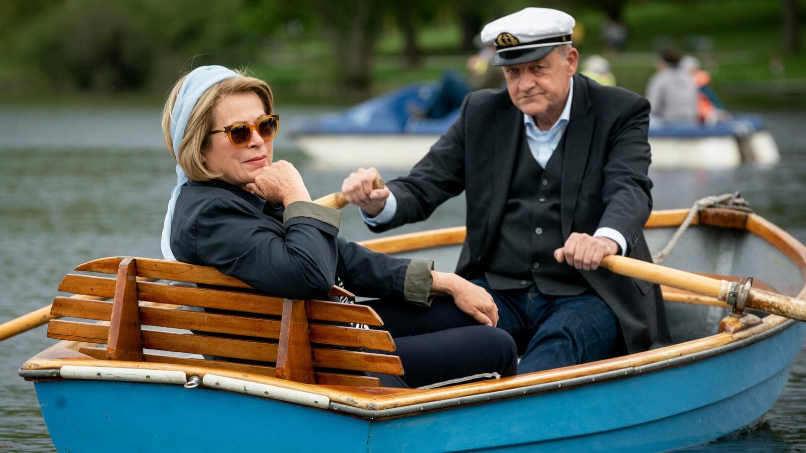 SchutzengelDas Geld für die Kreuzfahrt ist weg, aber Georg Wilsberg (Leonard Lansink) hält seine Versprechen und schippert mit Anna Springer (Rita Russek) immerhin über den Aasee.Bild: © ZDF und Thomas Kost./Thomas Kost