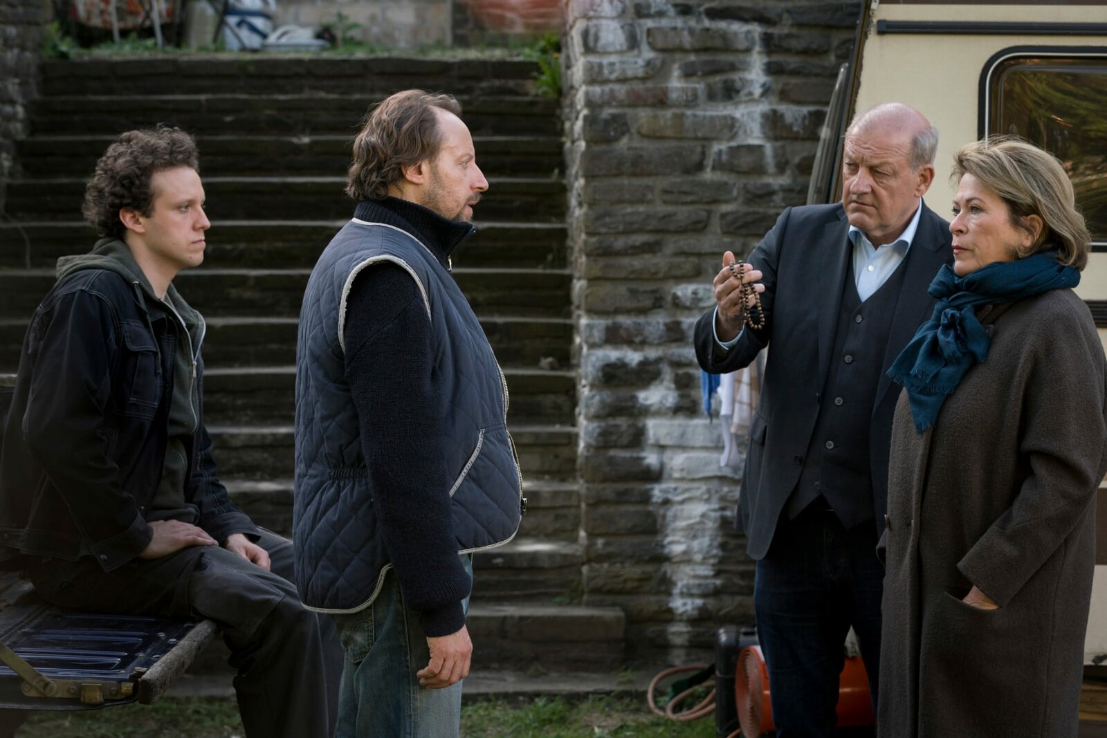 Gottes Werk und Satans KohleAndrej (Andreas Dyszewski, l.) und Marek (Ivan Shvedoff, 2.v.l.) müssen Georg Wilsberg (Leonard Lansink, 2.v.r.) und Kriminalhauptkommissarin Anna Springer (Rita Russek, r.) Rede und Antwort stehen.Bild: © ZDF und Thomas Kost.