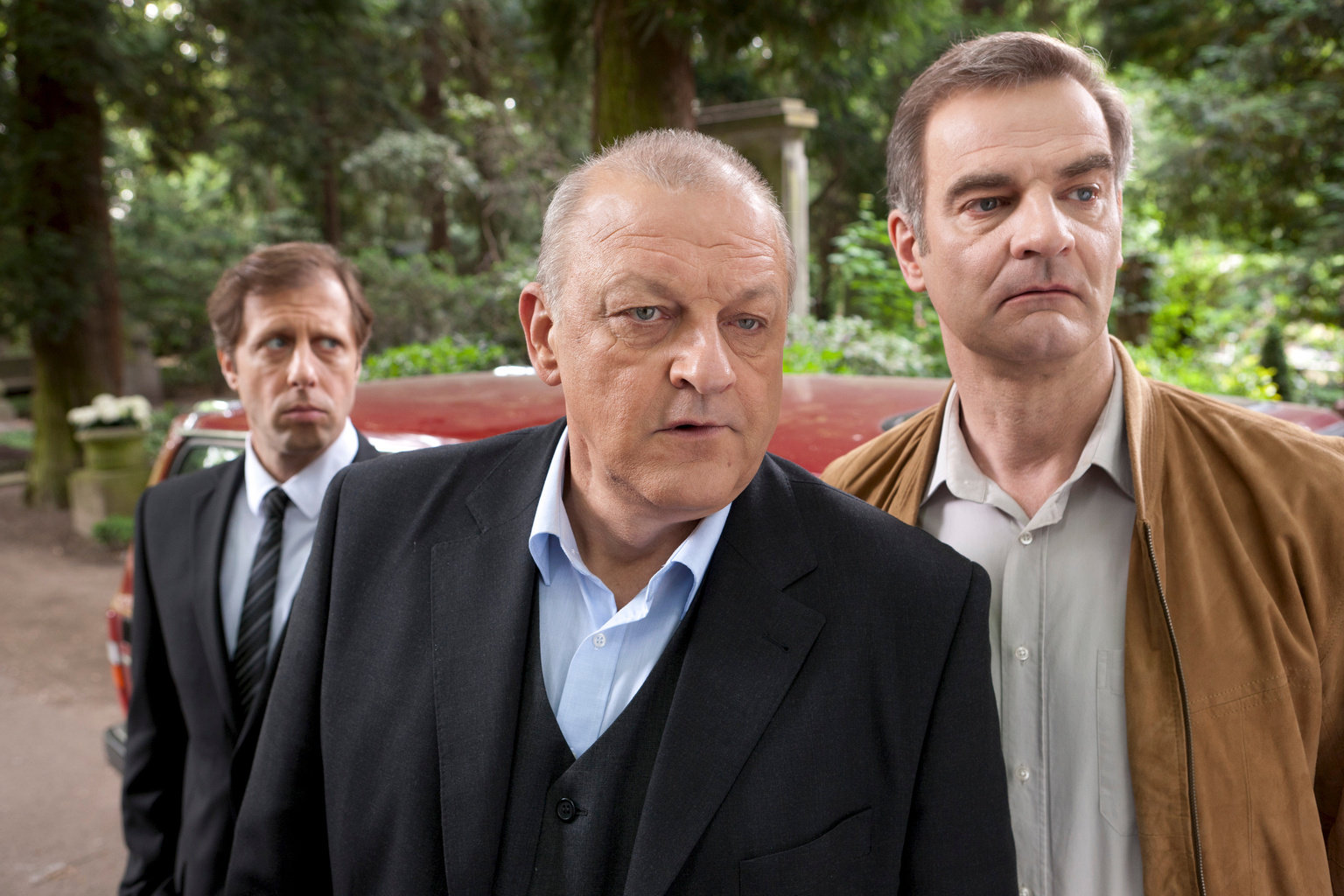 Die Bielefeld-VerschwörungErkennen Ekki (Oliver Korittke, l.), Wilsberg (Leonard Lansink, M.) und Manni (Heinrich Schafmeister, r.) zu spät, dass sie es möglicherweise mit einer großen Verschwörung zu tun haben?Bild: © ZDF / Thomas Kost