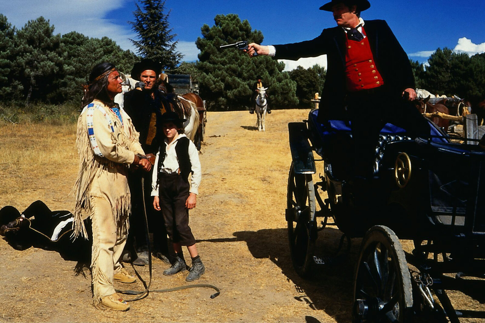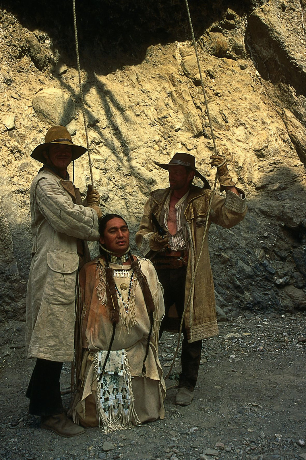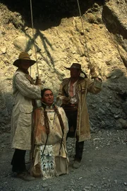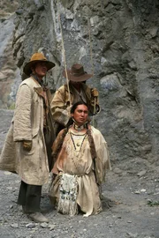 Teil 13 Die skrupellosen Skalpjäger - allen voran Spencer (Tobias Hoesl, li.) - wollen mit Tanka (Buffalo Child) kurzen Prozeß machen.Bild: © ZDF und Peter W. Engelmeier; Ziegler Film Gmbh & Co KG