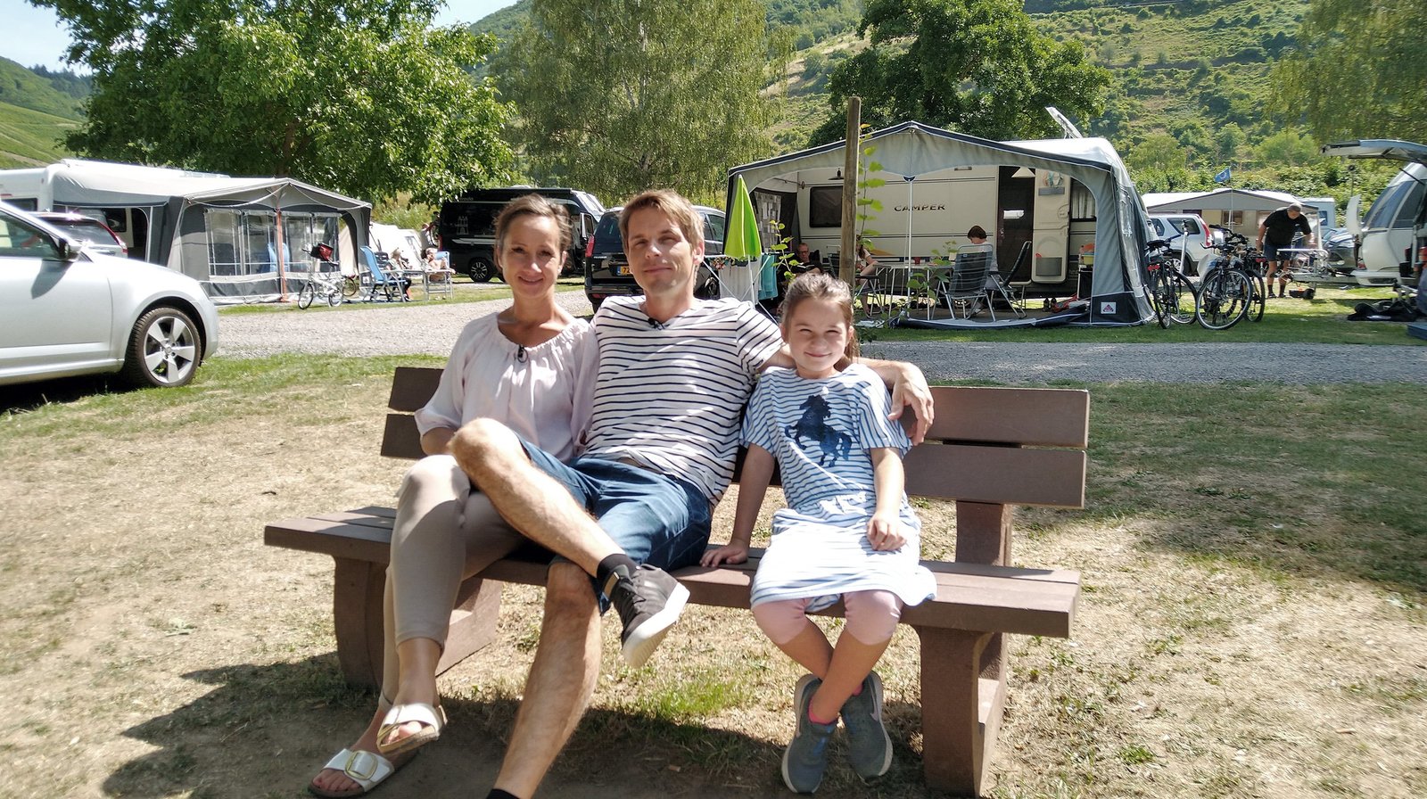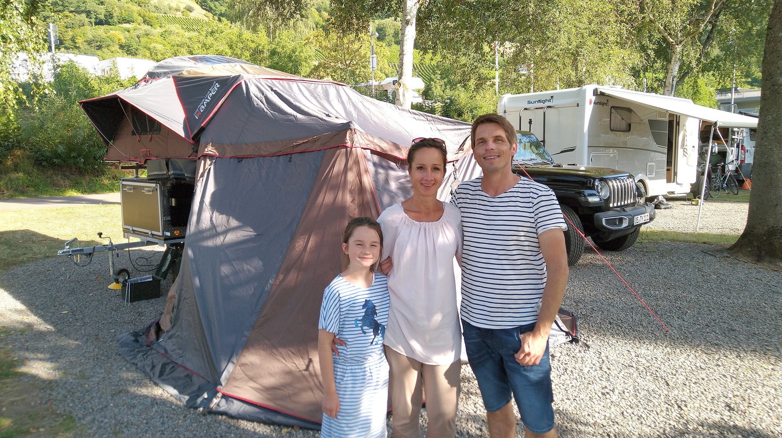 Tino und Yvonne mit Samiya aus KirchhundemYvonne (44), Samiya (9) und Tino (44) Gittel vor ihrem Vorzelt.Bild: © WDR/sagamedia