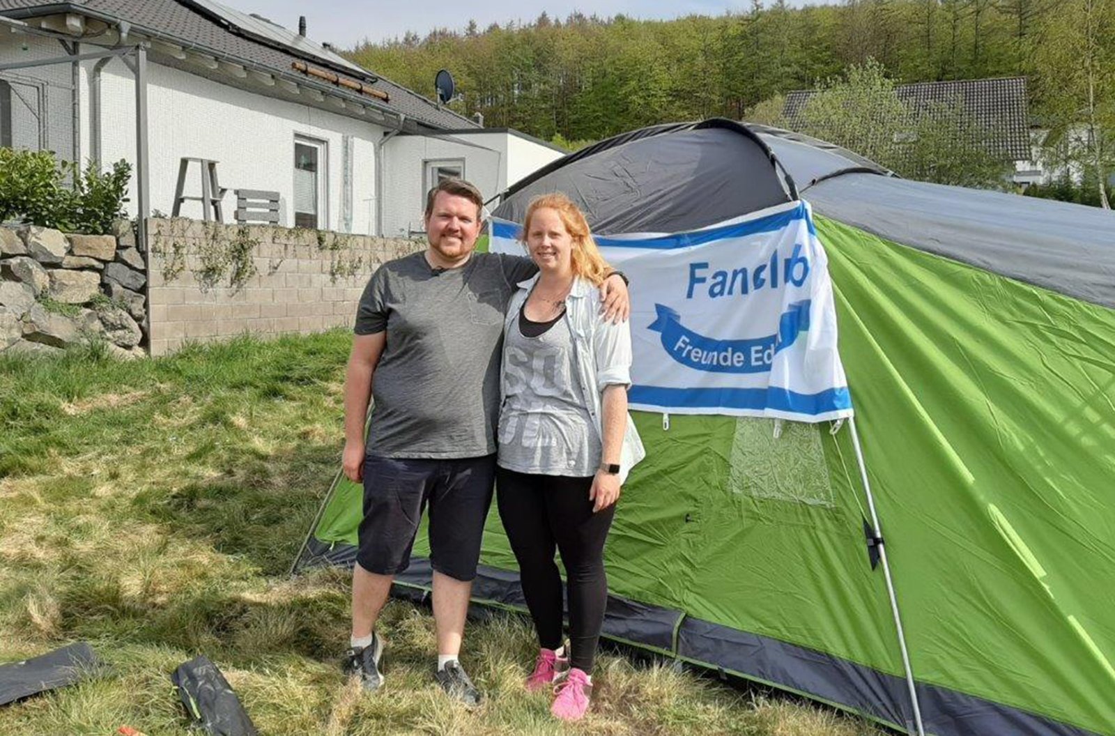 Familie Fischer aus SiegenKevin (l) und Anna Fischer vor ihrem Zelt mit VFL-Fahne.Bild: © WDR/sagamedia