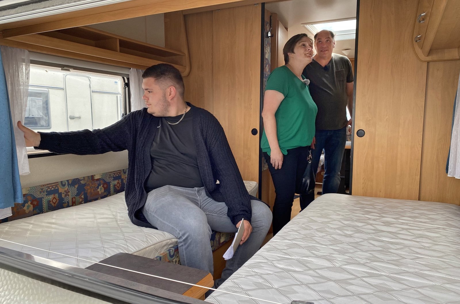 Familie Hesse aus Bad SalzuflenJannik (l), Nicole und Jo?rg Hesse (r) besichtigen einen gebrauchten Wohnwagen.Bild: © WDR