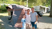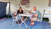 Tino und Yvonne mit Samiya aus KirchhundemSamiya (9), Yvonne (44), und Tino (44) Gittel machen nach dem Zeltaufbau eine PauseBild: © WDR/sagamedia