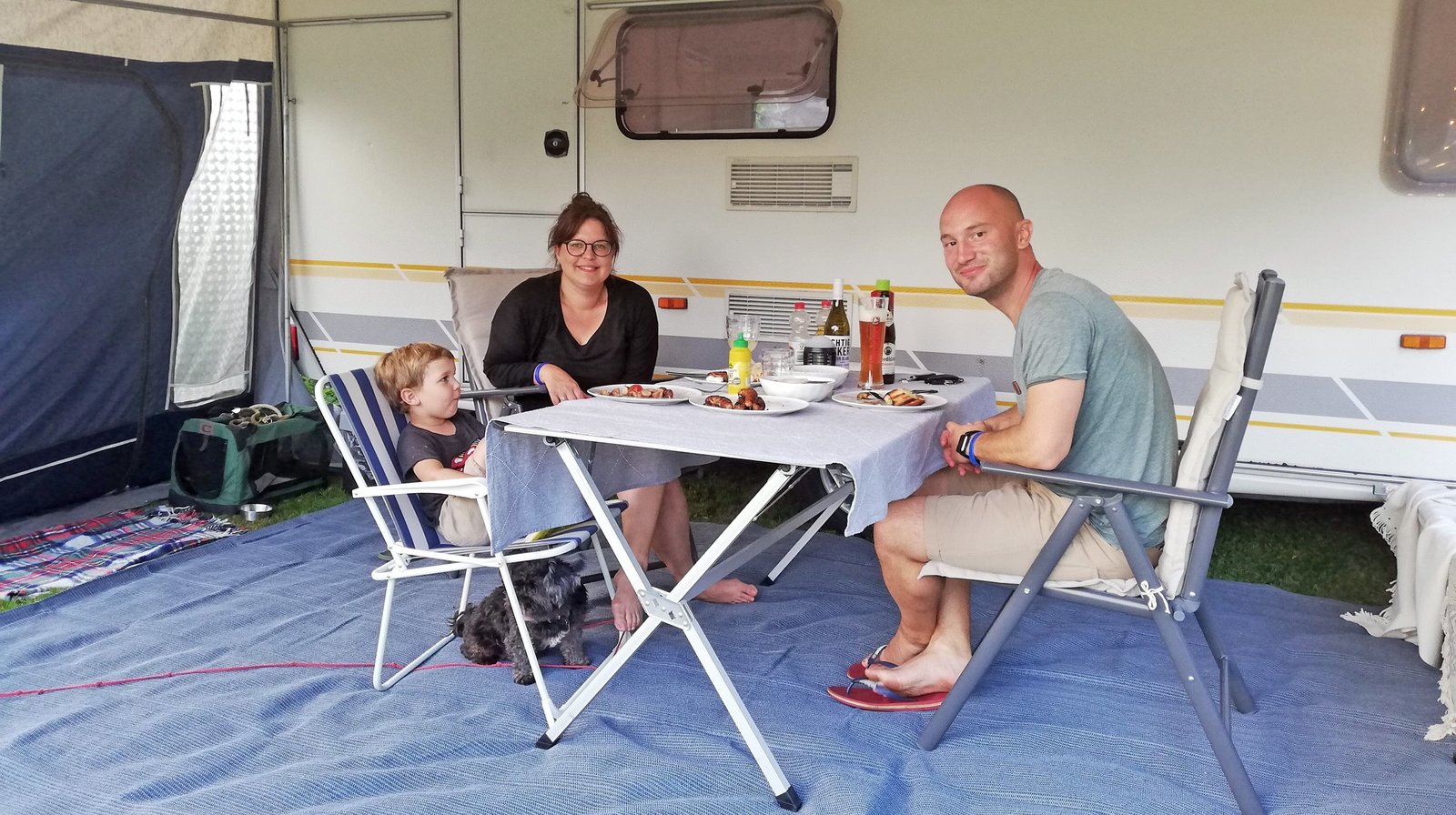Julia und Stefan mit Sohn Klaas aus HöxterFamilie Handtke beim Abendessen auf dem Campingplatz.Bild: © WDR/sagamedia
