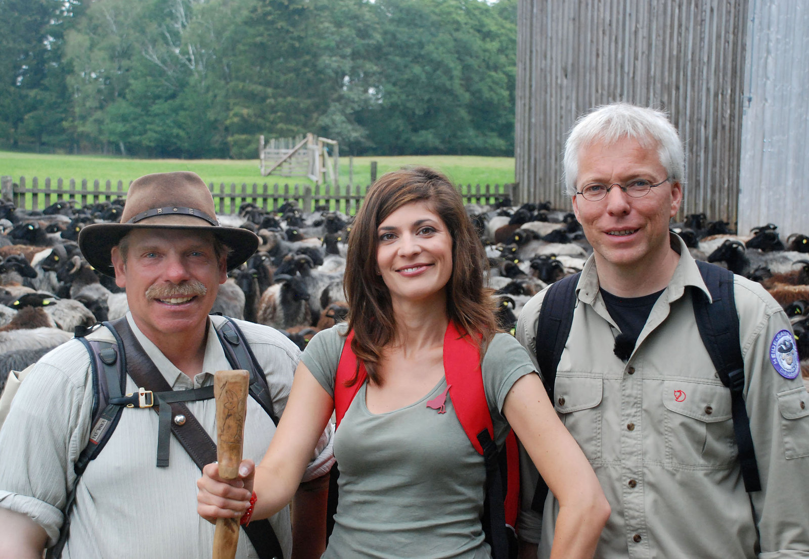 Die Lüneburger Heide - wo der Urlaub blüht ...Moderatorin Katty Salié mit Guide Jan Brockmann (r) vom Heide-Erlebniszentrum und Heidschnuckenschäfer Uwe Storm (l).Bild: © HR/WDR/Thomas Rosteck