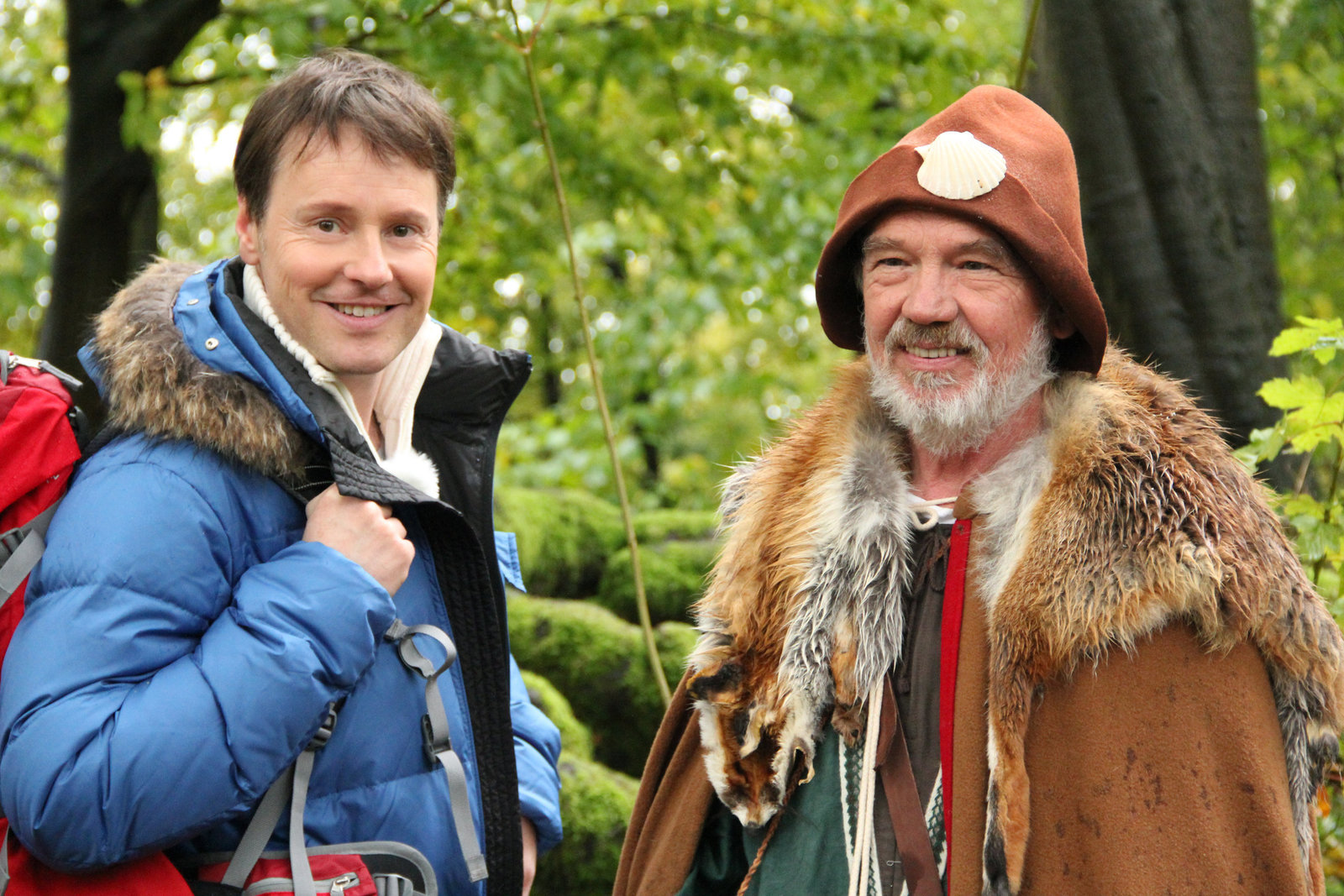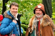 Ich bleib' dann mal hier - auf dem Jakobsweg in NRWModerator Stefan Pinnow (l) trifft auf seiner Wanderung u.a. auch Werner Best, Archäologe, der ein historisches Pilgergewand trägt.Bild: © HR/WDR/Christoph Berg