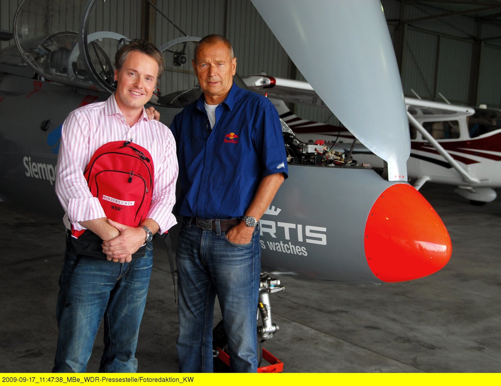 Die Sieg - Von der Quelle bis zur Mündung. . WDR Fernsehen WUNDERSCH÷N!, "Die Sieg - Von der Quelle bis zur M¸ndung", am Sonntag (11.10.09) um 20:15 Uhr. Moderator Stefan Pinnow mit dem bekannten Piloten Walter Eichhorn (r). © WDR/Ralf Gierkes, honorarfrei - Verwendung gem‰fl der AGB im engen inhaltlichen, redaktionellem Zusammenhang mit genannter WDR-Sendung bei Nennung "Bild: WDR/Ralf Gierkes" (S1). WDR-Pressestelle/Fotoredaktion, Kˆln, Tel: 0221/220 -2408 oder -4405, Fax: -8471, fotoredaktion@wdr.de.Bild: © WDR