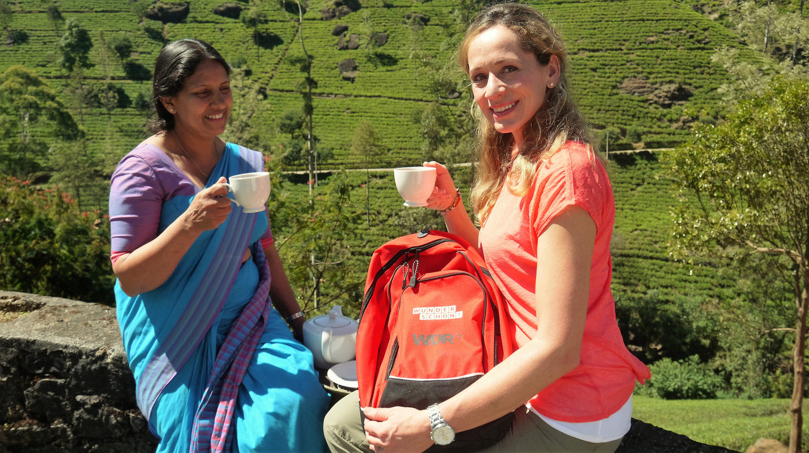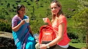 Sri Lanka - Perle im Indischen OzeanDie Zugfahrt durch das grüne Hochland mit ihren Teeplantagen gehört zu den Highlights einer Sri-Lanka-Reise. Das Ziel von Tamina Kallert (r) ist Nuwara Eliya, einst Sommerfrische für die britischen Kolonialherren. Das kühle Klima auf 1.800 Metern Höhe ist ideal für den Anbau von Tee und machte Sri Lanka zu einem der größten Tee-Exporteure der Welt. Tamina Kallert lässt sich zeigen, wie der berühmte Ceylon-Tee gepflückt, getrocknet und verarbeitet wird.Bild: © WDR/Per Schnell