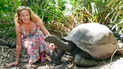 Traumziel SeychellenModeratorin Tamina Kallert mit einer freilaufenden Riesenschildkröte.Bild: © ZDF und WDR/Sabine Fricke