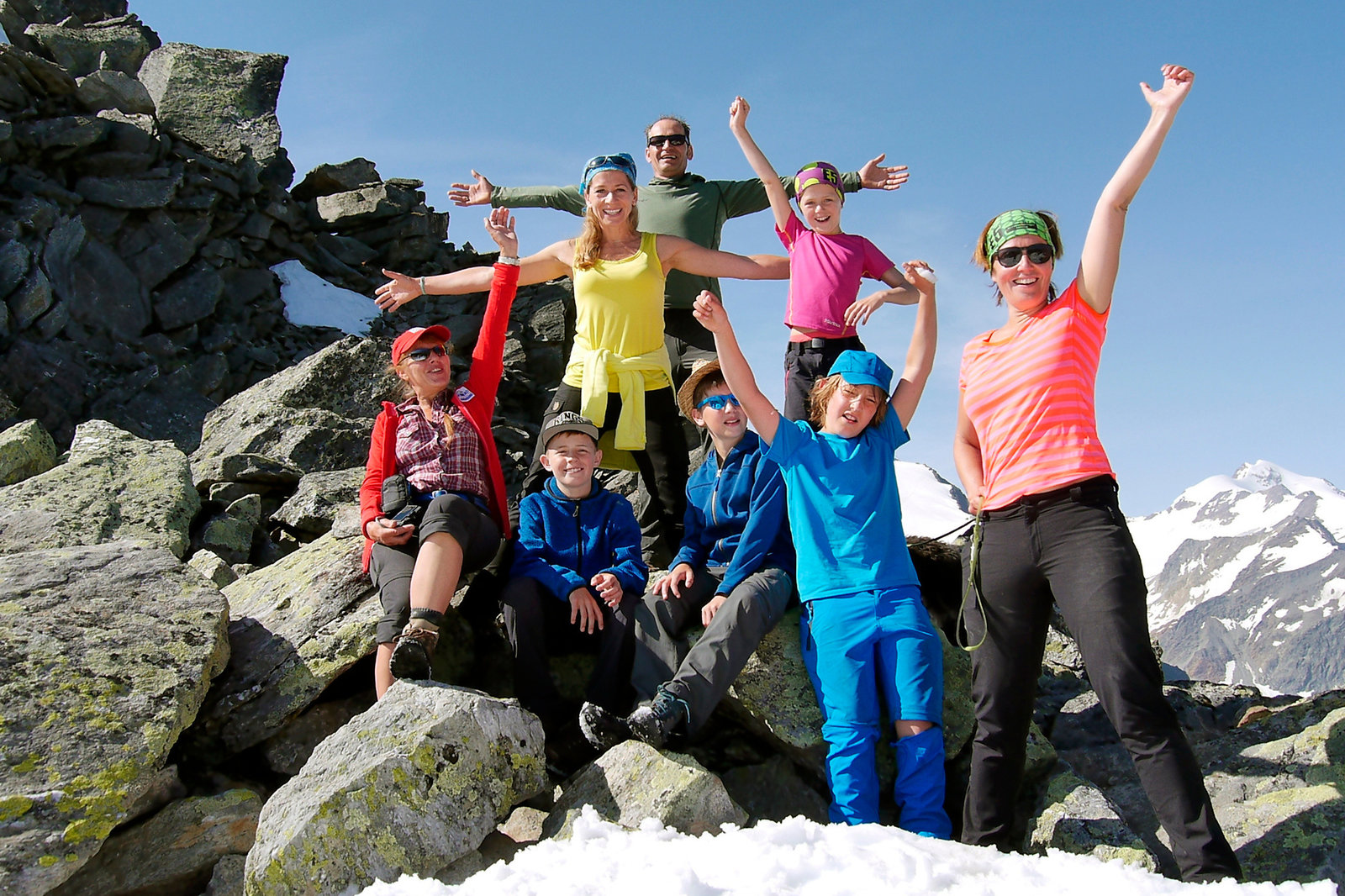 Komm, wir wandern über die Alpen - Mit zwei Familien von Oberstdorf nach MeranÜber 3000 Meter! Moderatorin Tamina Kallert (2.v.l.) und die "Wunderschön!"-Wandergruppe oberhalb vom Pitztaler Jöchl - mit 3001 Metern dem höchsten Punkt der E5-Wanderung.Bild: © ZDF und WDR/Karen Wesselmann