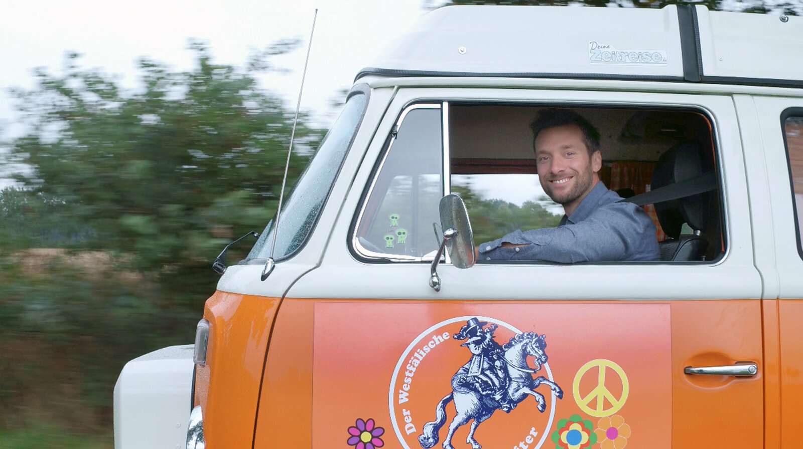 Auf der Friedensroute zwischen Münster und OsnabrückDie "Friedenroute" zwischen Münster und Osnabrück ist eine Reise wert. Vor 370 Jahren wurden zwischen den beiden Städten die Kuriere hin- und hergeschickt, um den westfälischen Frieden zu verhandeln und damit den 30jährigen Krieg zu beenden. Und so klebt sich Daniel Aßmann das Peace-Zeichen auf seinen orangefarbenen Bulli und macht sich auf die Suche nach geschichtsträchtigen und wunderschönen Orten.Bild: © HR/WDR