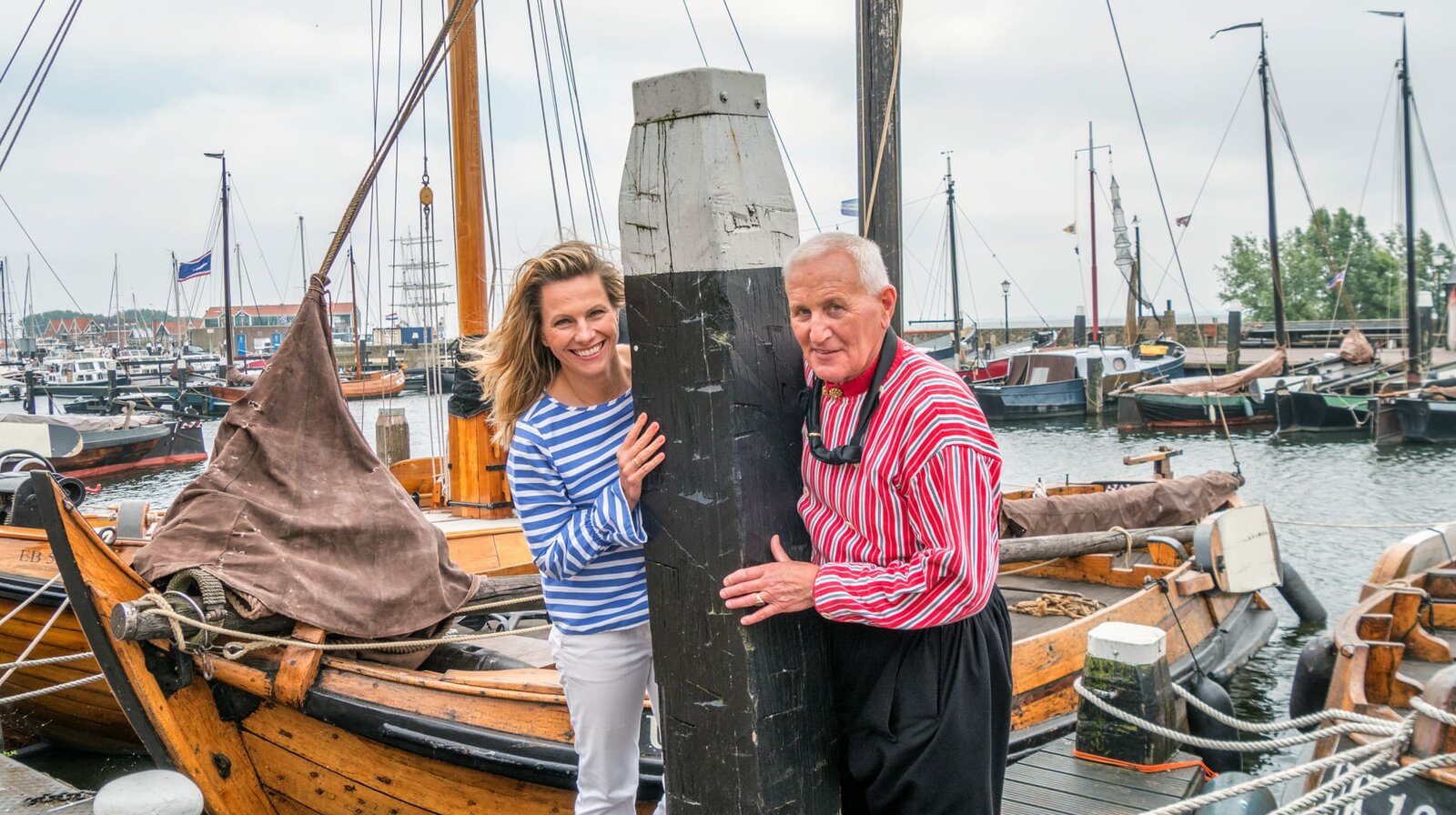 Wasserwelt Flevoland - Die jüngsten Polder der NiederlandeModeratorin Andrea Grießmann mit Guide und ehemaligen Fischer Jan van Urk im Hafen der Ortschaft Urk auf Flevoland. Der Ort Urk war vor der Einpolderung eine Insel.Bild: © HR/WDR/Sabine Fricke