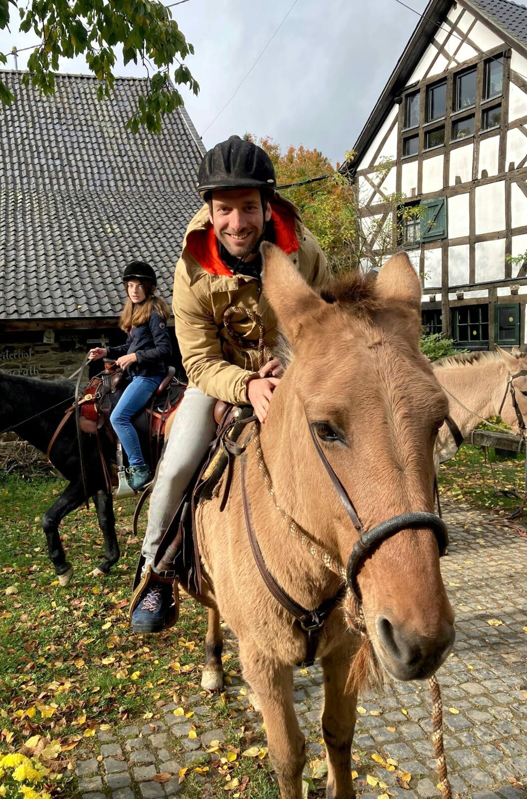 Herbst in der südlichen EifelAusritte mit Pferden, Eseln und Maultieren sind bei den Gästen des Honerather Hofs in sehr beliebt. - Moderator Daniel Aßmann (vorn)Bild: © WDR/Antje Baumgarten