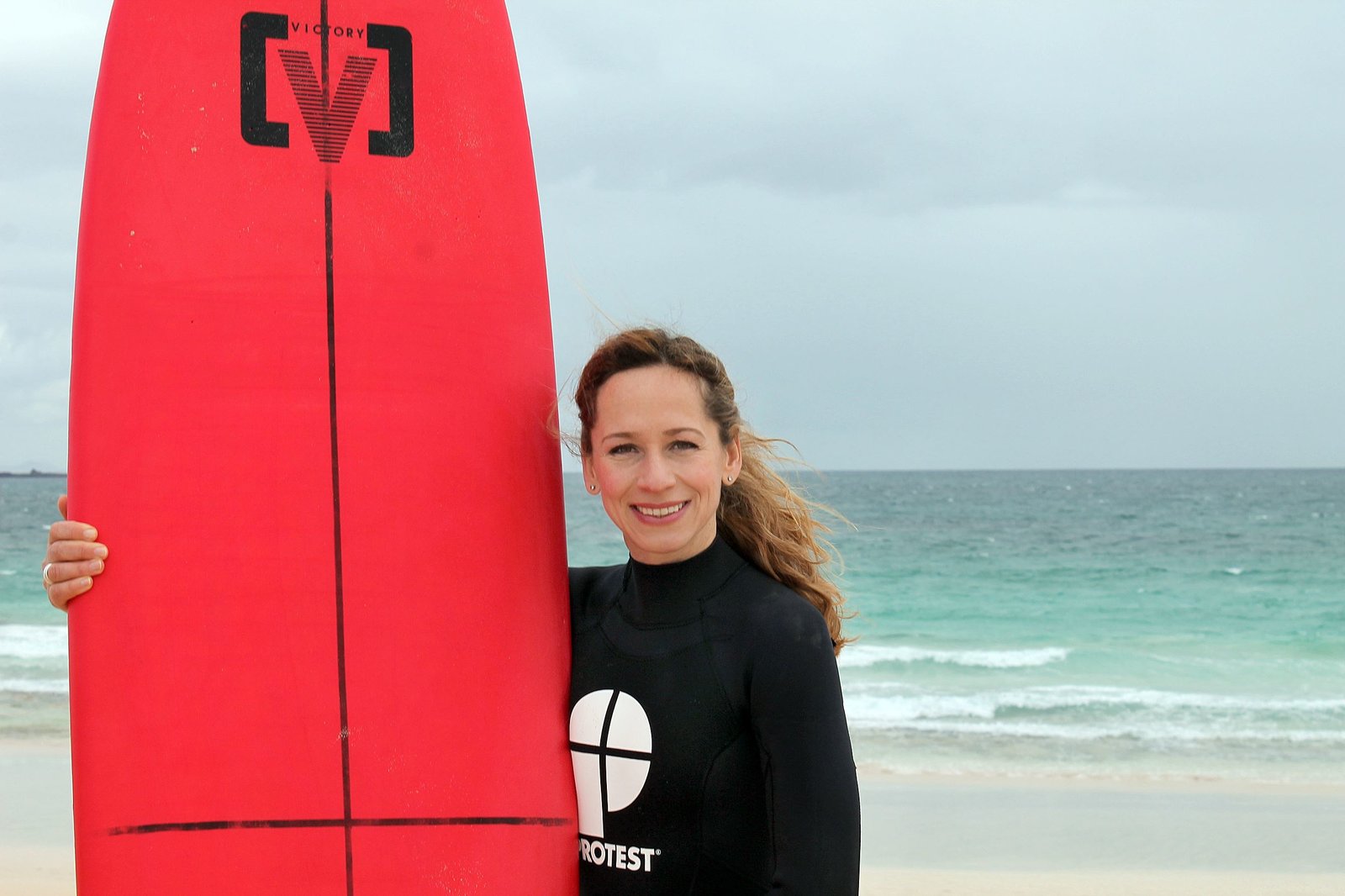 Weihnachtliches MünsterlandModeratorin Tamina Kallert wagt sich am Strand von Corralejo mit dem Surfbrett aufs Meer.Bild: © WDR/Richard Hofer