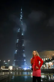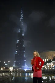 Von Dubai nach Abu Dhabi - Geschichten aus dem OrientModeratorin Andrea Grießmann unterwegs in Dubai - im Hintergrund der Burj Khalifa, das höchste Gebäude der Welt.Bild: © BR/WDR/Hans Christian Mebold / Hans Christian Mebold