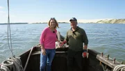 Sehnsucht nach LitauenModeratorin Andrea Grießmann mit Kurenkahn-Kapitän Aurelijus Armonavicius auf dem Kurischen Haff.Bild: © WDR/Julian Homann