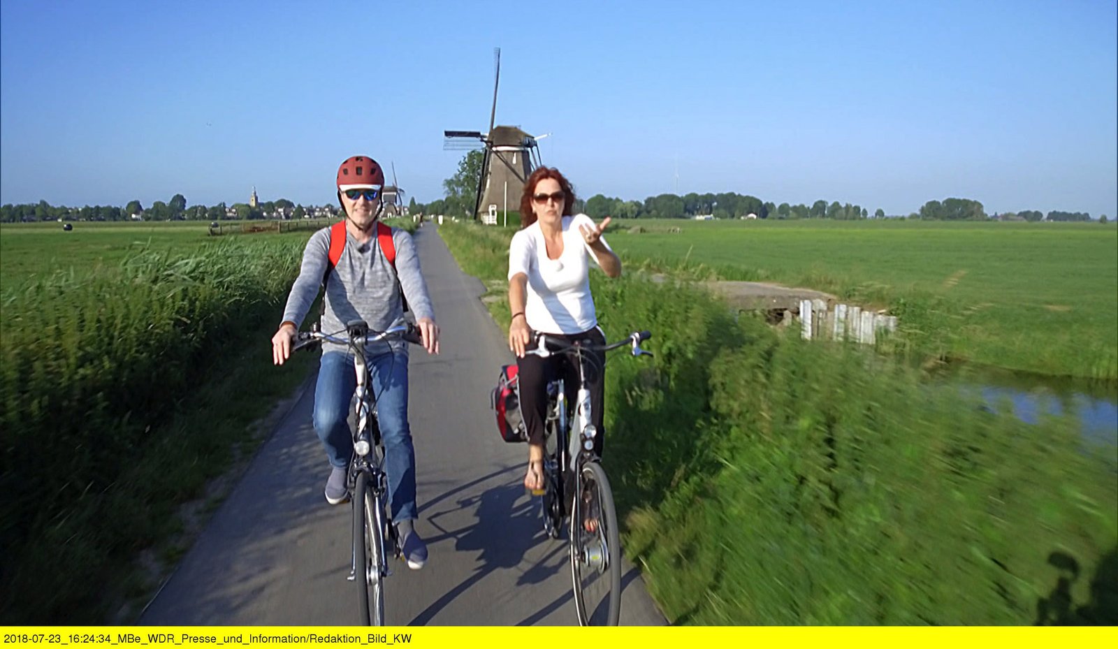 Mit Schiff und Rad durch HollandModerator Stefan Pinnow (links) und Reiseleiterin Sybrich Willemsa auf dem Weg zum Windmühlenpark Kinderdijk.Bild: © BR/WDR