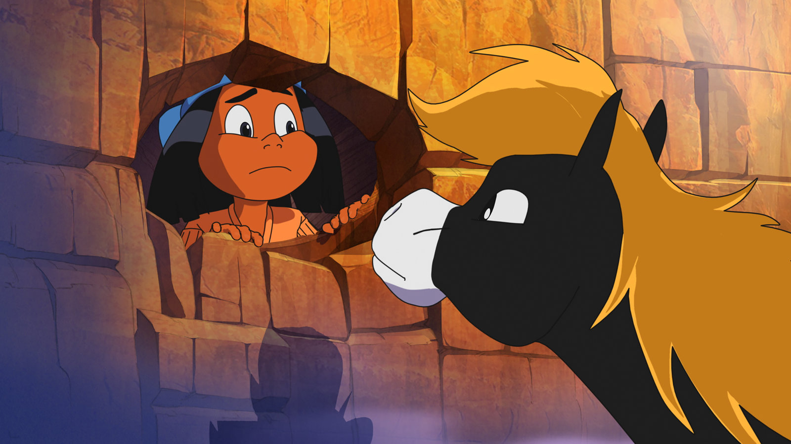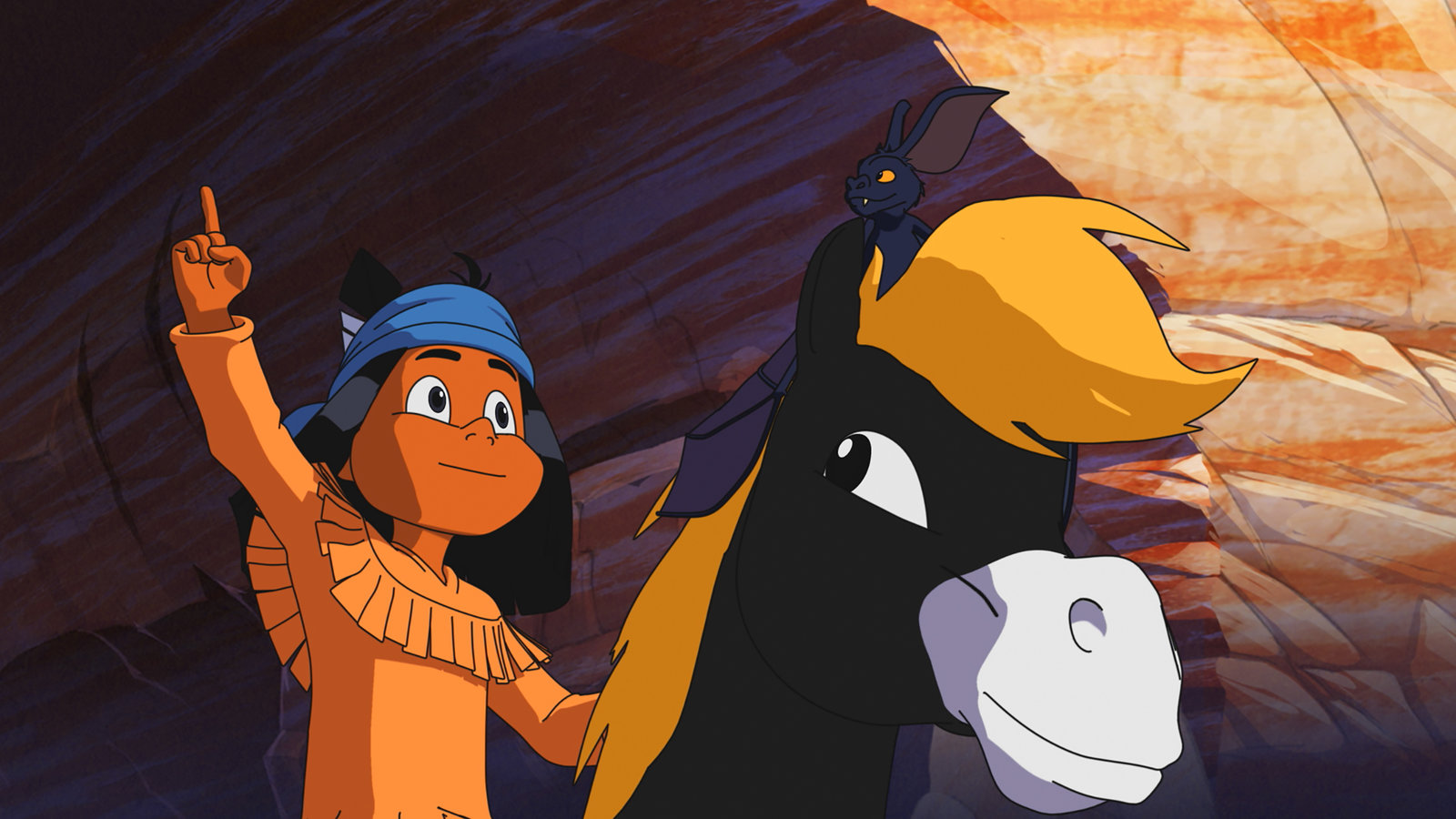 Der Zorn der RabenYakari hat in einer Höhle Unterschlupf vor den Raben gefunden und bittet sein Pony Kleiner Donner um Hilfe.Bild: © WDR/Ellipsanime Productions/Belvision/Les Cartooneurs Associés/2 Minute