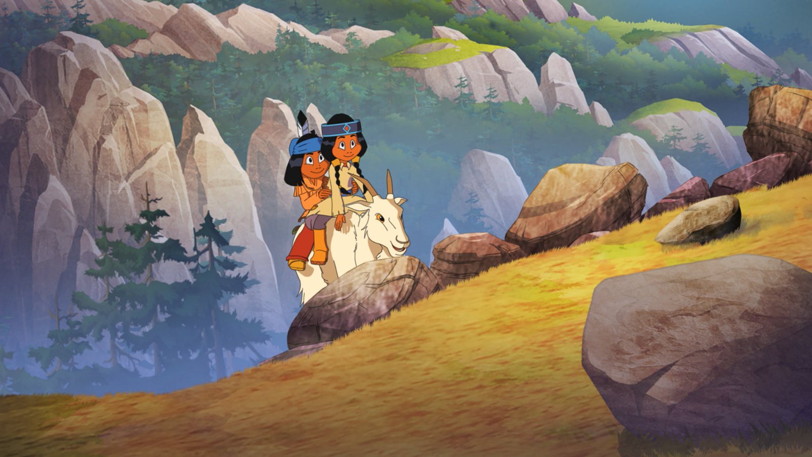 AdlerschnabelRegenbogen und Yakari lassen sich von der Bergziege Zartes Horn hinabtragen.Bild: © WDR/Storimage