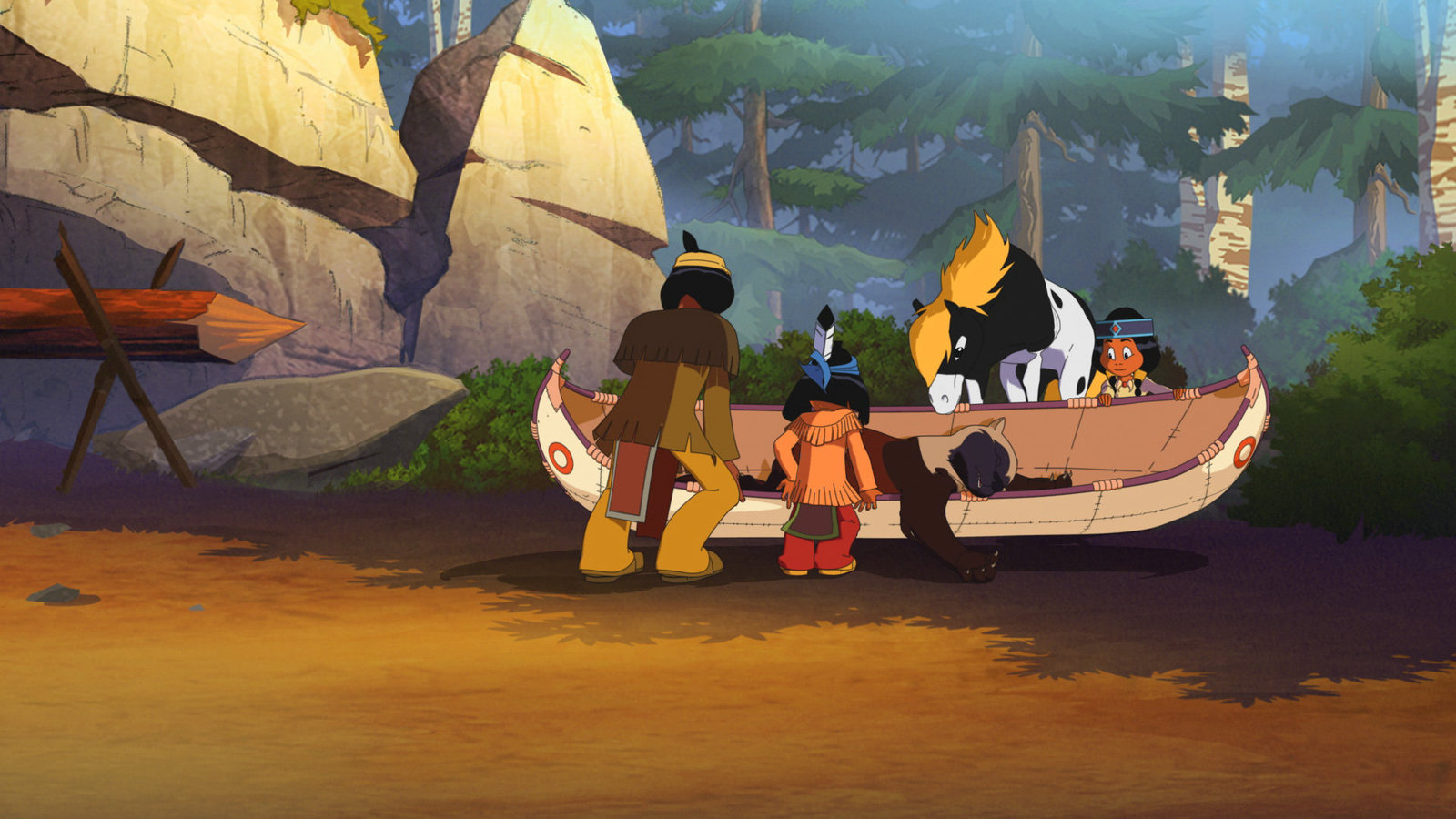 Die verschwundenen FischeYakari trifft Müder Krieger, der versucht sein löchriges Kanu mt Harz zu kitten.Bild: © WDR/Storimages