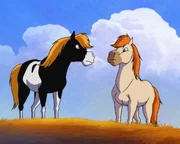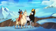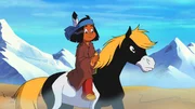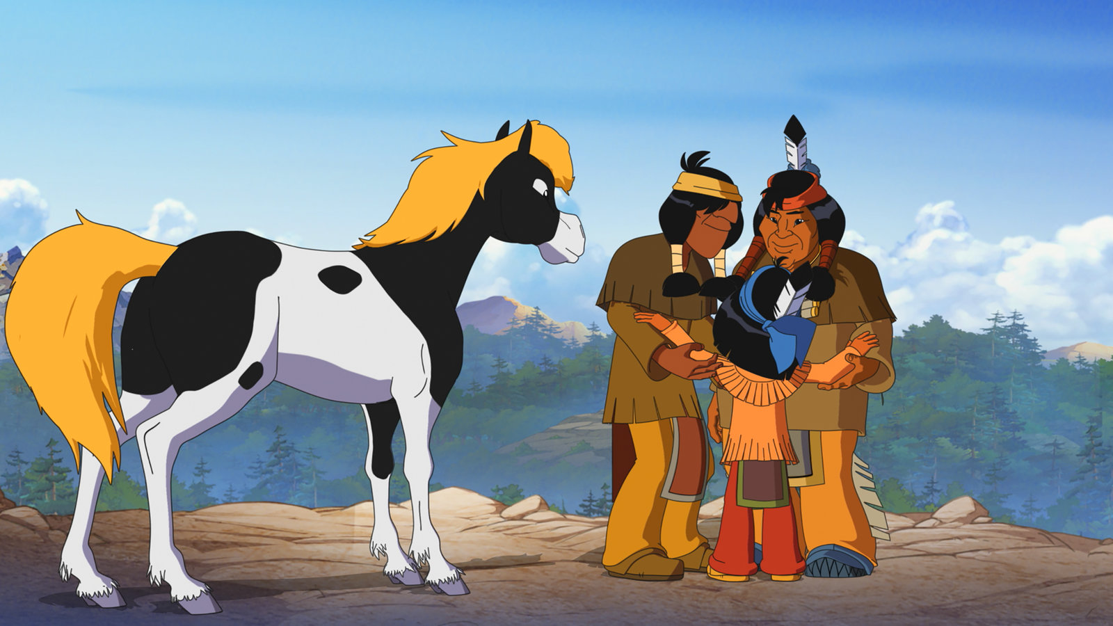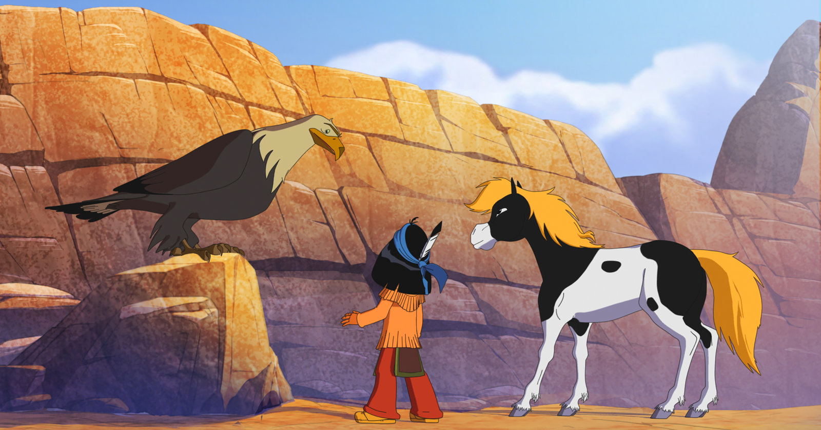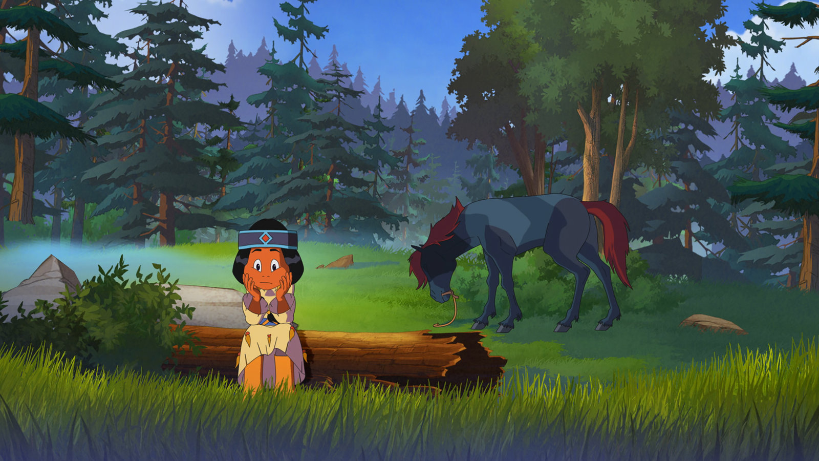 Der Zorn der RabenRegenbogen wartet auf Yakari, im Hintergrund ihr Pferd Großer GrauerBild: © WDR/Ellipsanime Productions/Belvision/Les Cartooneurs Associés/2 Minute