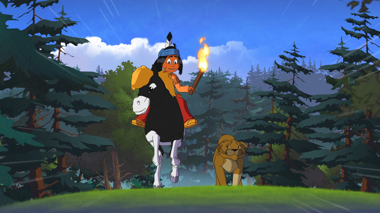 Totem YakariYakari (l.) das Katzenfrettchen Großauge und Pony Kleiner DonnerBild: © WDR/Storimage