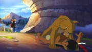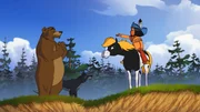 Zwei ganz verschiedene FreundeBesorgte Eltern suchen ihre Kinder: Bär Fischbeißer und Wolf Großer Hauer. Yakari und Pony Kleiner Donner wollen den beiden helfen.Bild: © WDR/Ellipsanime Productions/Belvision/Les Cartooneurs Associés/2 Minute