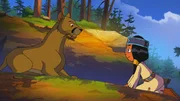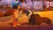 Der Pfad der BisonsKleiner Dachs (u.) und Wirbelwind (o.) werden von einem Grizzly angegriffen.Bild: © WDR/Ellipsanime Productions/Belvision/Les Cartooneurs Associés/2 Minute