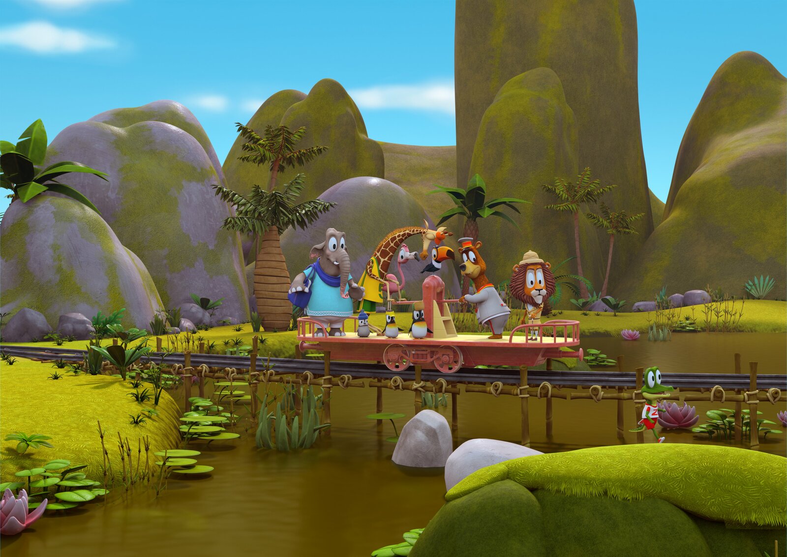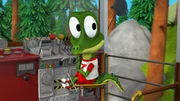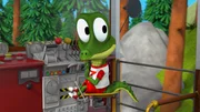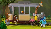 Die VerfolgungsjagdZacki, das Krokodil, ist verzweifelt, die Bahn hat sich selbständig gemacht und ist ohne die Tiere einfach davon gefahren. Nun verfolgen sie die verrückt gewordene Bahn: Zacki läuft vorneweg und die Freunde kommen auf der Draisine nach.Bild: © ZDF/Grid Animation, TELEGAEL