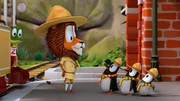 LausalarmLionel (Löwe) ermahnt die Pinguine, stramm zu stehen und nicht herum zu zappeln.Bild: © ZDF/Gaumont Animation/PP Animation III Inc.