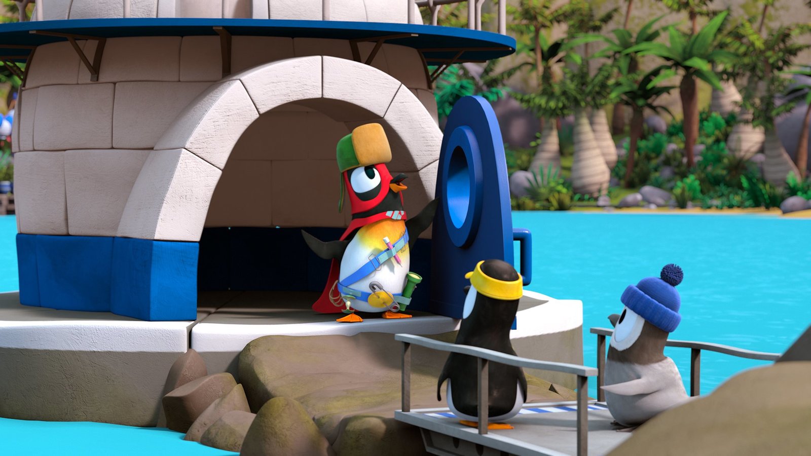 Superheld JonathanPinguin Jonathan (in der T??r) spielt den Superhelden "Phantomfrack".Bild: © ZDF/Gaumont Animation/PP Animation III Inc.