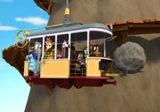 Brunos DurchhängerDie Zoobande hat es geschafft: Endlich liegt der Felsbrocken nicht mehr auf den Schienen sondern auf den Gabelstaplern der Bahn. Balduin, der Bär, und Zacki haben die Bahn in ein "Helimobil" verwandelt und bringen den Brocken zusammen mit ihren Freunden weg.Bild: © ZDF/Grid Animation, TELEGAEL