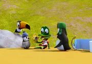 LausalarmFlora (Flamingo) lässt sich nicht von Jonathans (Pinguin li.) Superhelden-Gehabe beeindrucken.Bild: © ZDF/Gaumont Animation/PP Animation III Inc.