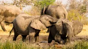 OkavangoElefanten graben ein Wasserloch im Okavango. Elefanten tun das während der Trockenzeit, um Zugang zu frischem Wasser zu erhalten.Bild: © ORF/BBC/Grab taken from screen.