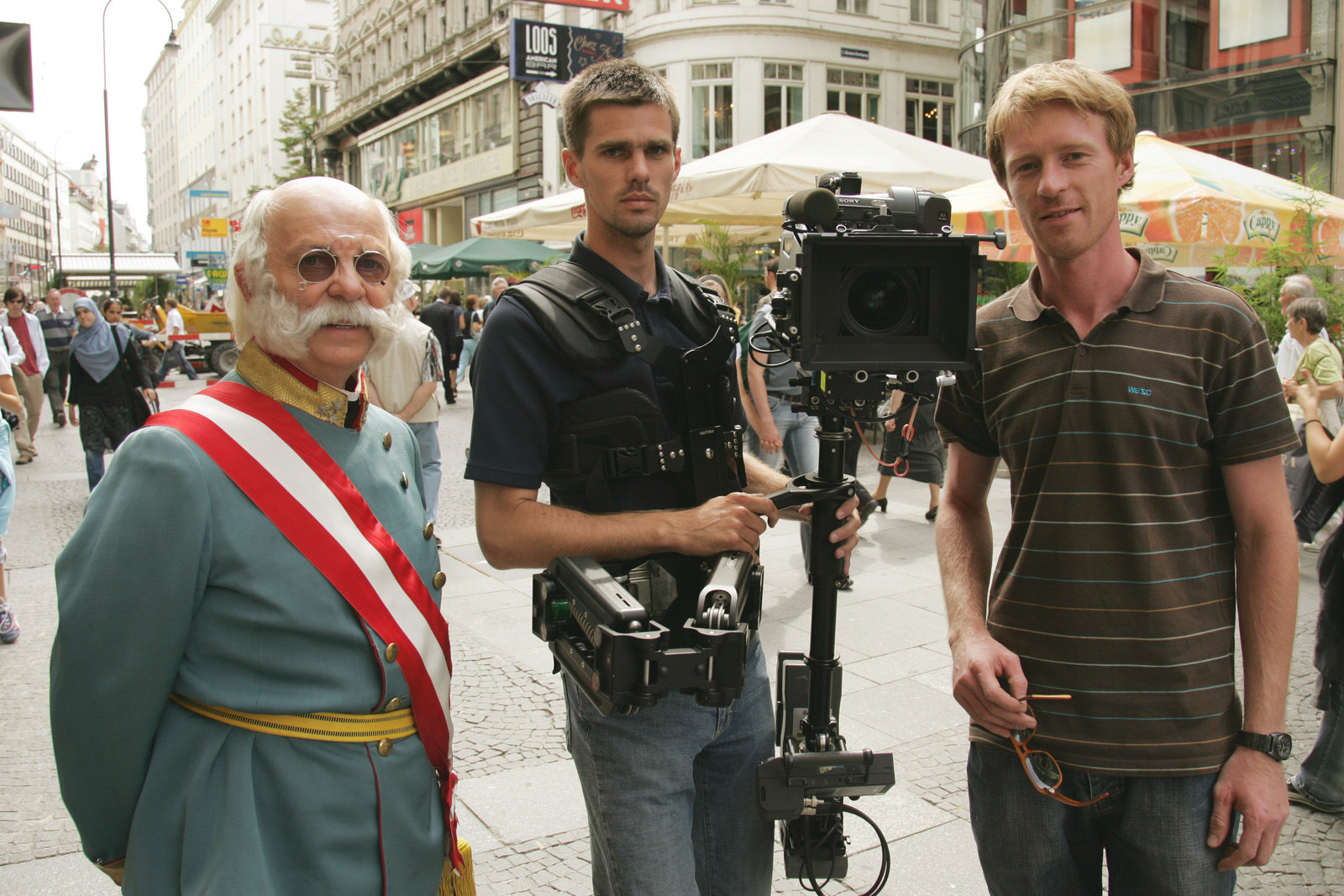 Kaiser Franz JosephKaiser Franz Joseph Darsteller, Steadicam Operator Klaus Achtern und Assistent Martin Stoni beim Dreh auf dem Wiener Stephansplatz.Bild: © ORF III