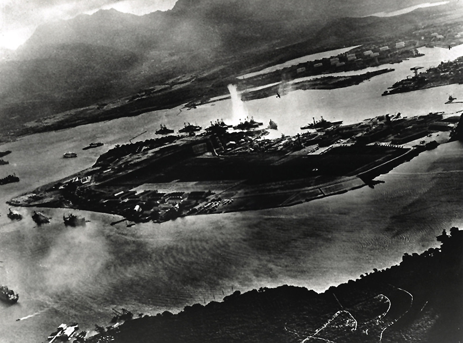 20.40 Angriff auf Pearl Harbor Momentaufnahme des japanischen Überfalls auf Pearl harbor: eine Schiffsexplosion, Flieger am Himmel und Torpedos im Wasser.Bild: © ZDF / © public domain