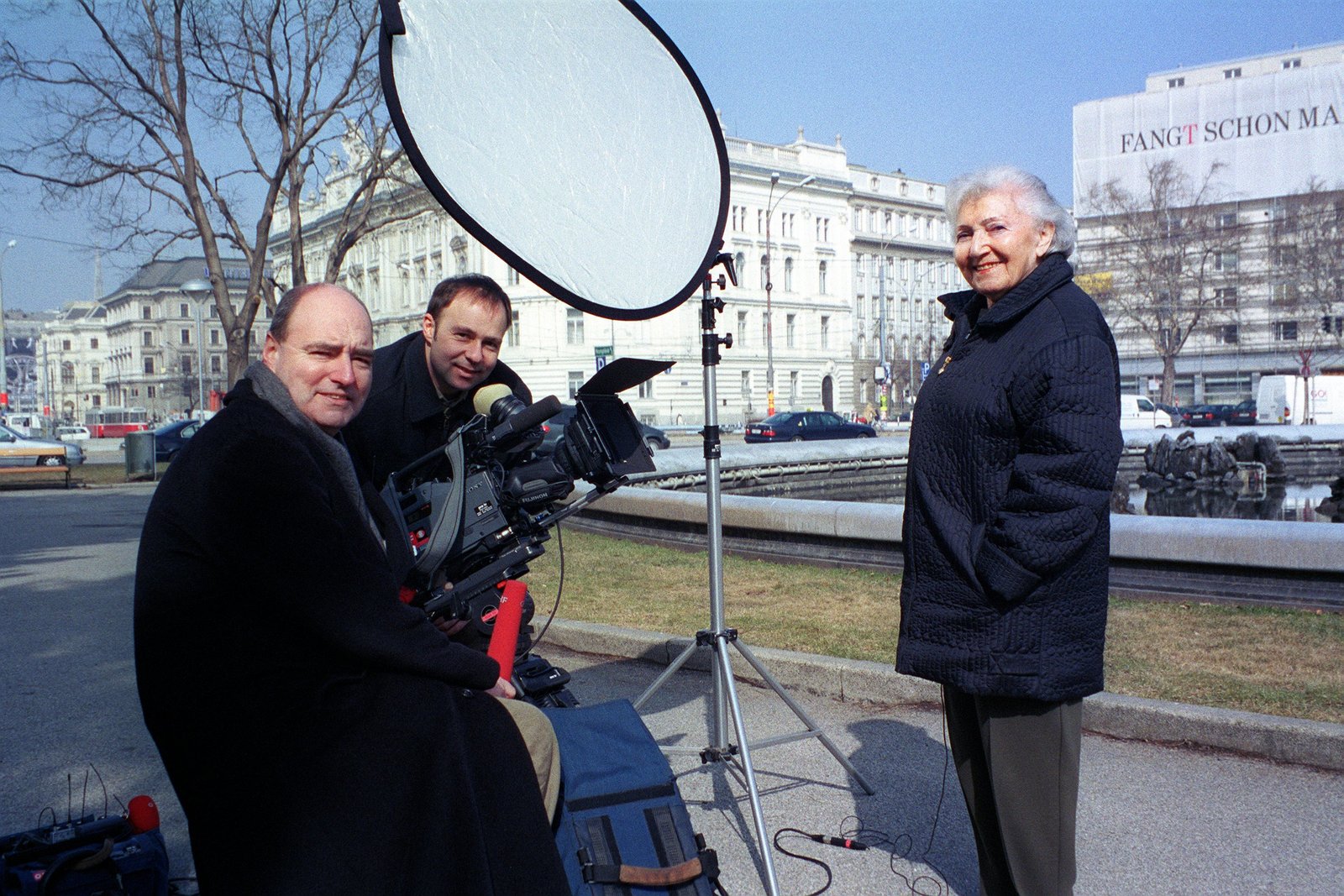 Mütter, Töchter, TrümmerfrauenAndreas Novak (Redakteur) und Christoph Koller (Kamera) mit der Auschwitz-Überlebenden Dagmar Ostermann bei den Dreharbeiten.Bild: © ORF III