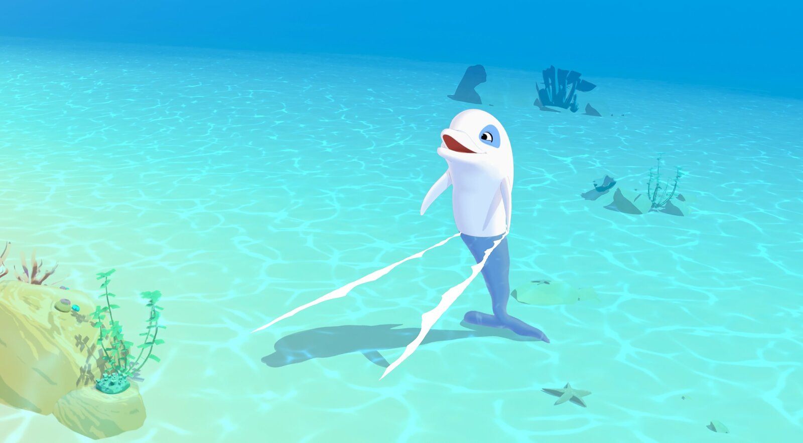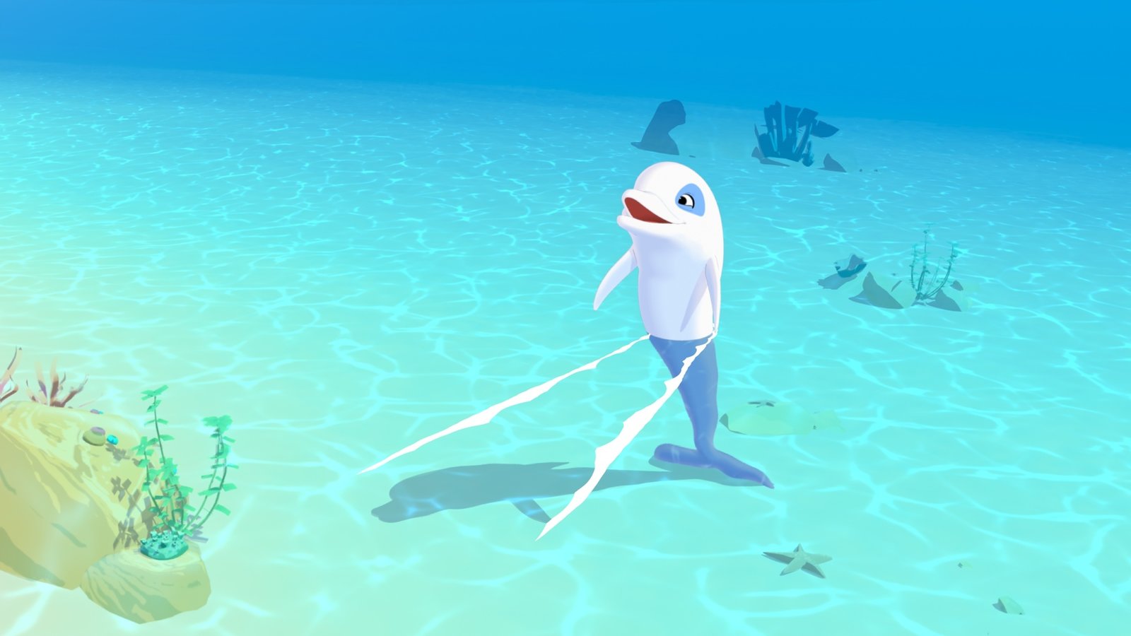 Mini-ZoomDer weiße Delfin Zoom schaut mit dem Kopf aus dem Wasser und schaut begeistert einem Fisch hinterher, der gerade neben ihm im Meer landet.Bild: © ZDF/Media Valley/Marzipan Films/TF1/Gaumont Animation