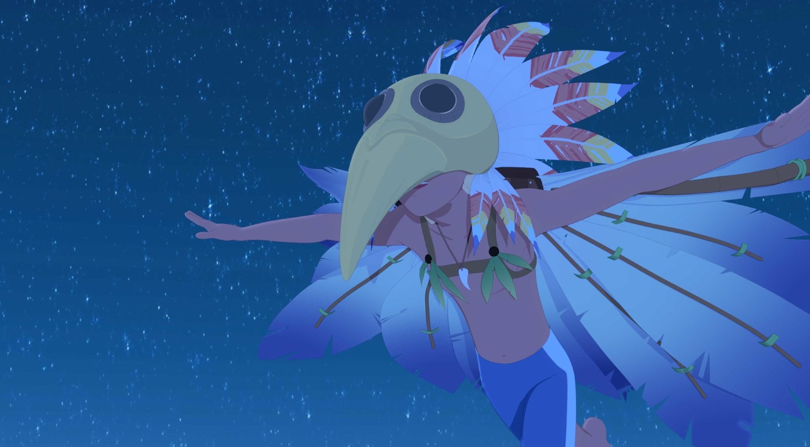 Ein Pinguin auf der FluchtYann hat sich mit einer Vogelmaske verkleidet und spielt einen der Geister von Maotou. Damit will er die Ganoven vertreiben, die das Dorf mit ihren Aktionen erschreckt hatten.Bild: © ZDF/Media Valley/Marzipan Films/TF1/Gaumont Animation